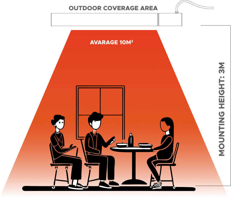 תנור החימום מתאים למגוון רחב של סביבות: חללים סגורים, מרפסות, חצרות, חללי אירוח, עסקים, בתי קפה ומסעדות. הדגם מספק חימום יעיל גם במקומות מאווררים וחצי-פתוחים.